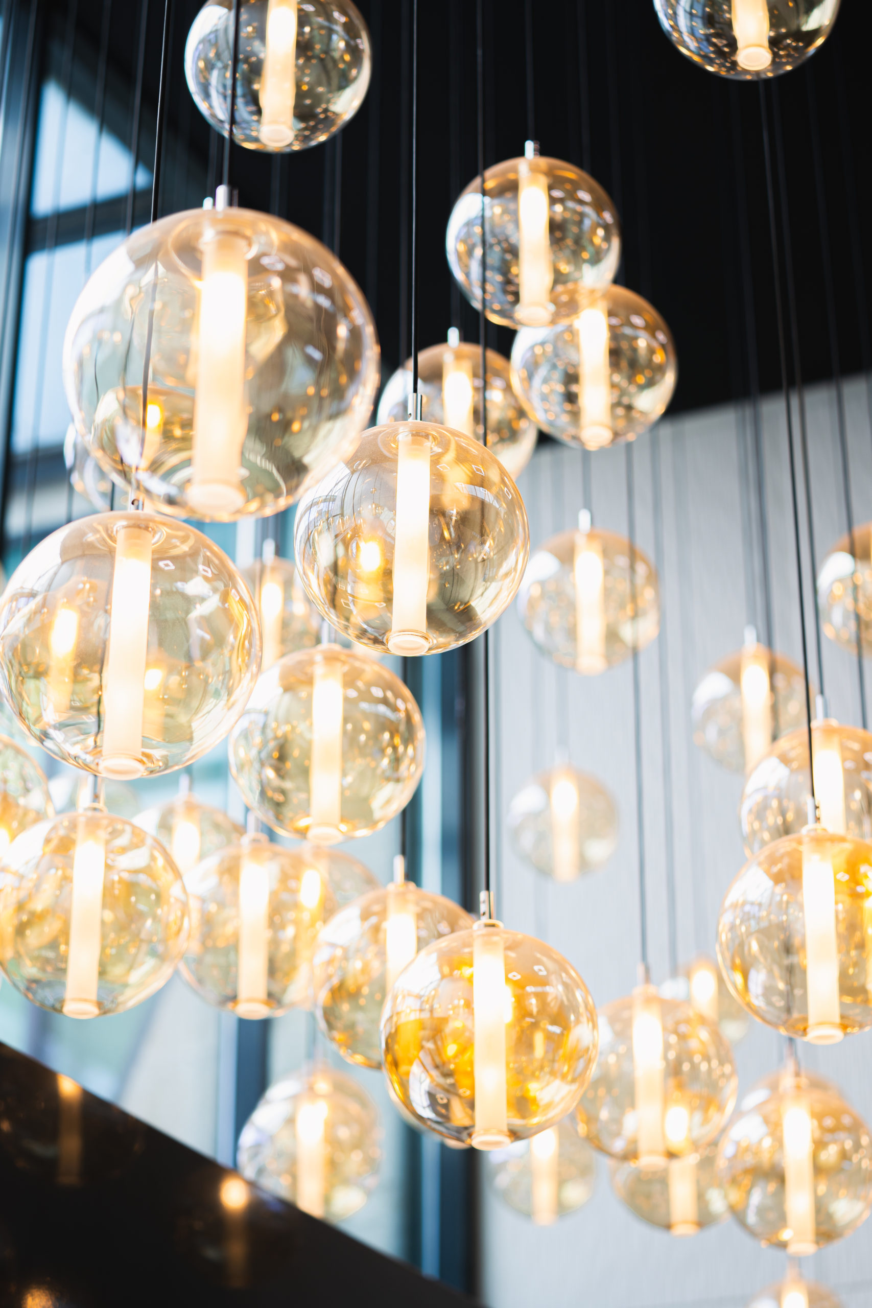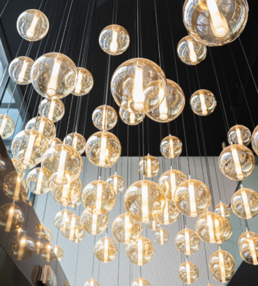 Un lustre sur mesure, composé de dizaines d’ampoules vintage, devient la pièce maîtresse de l’espace.